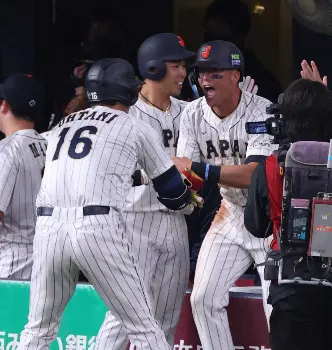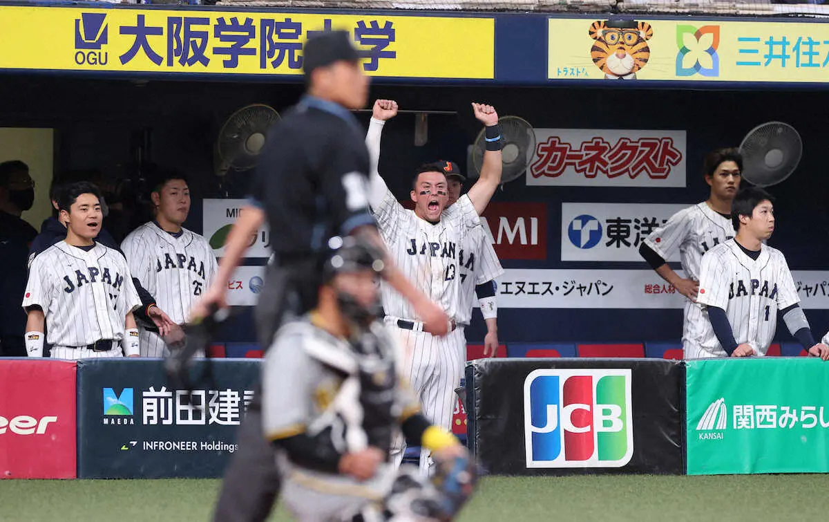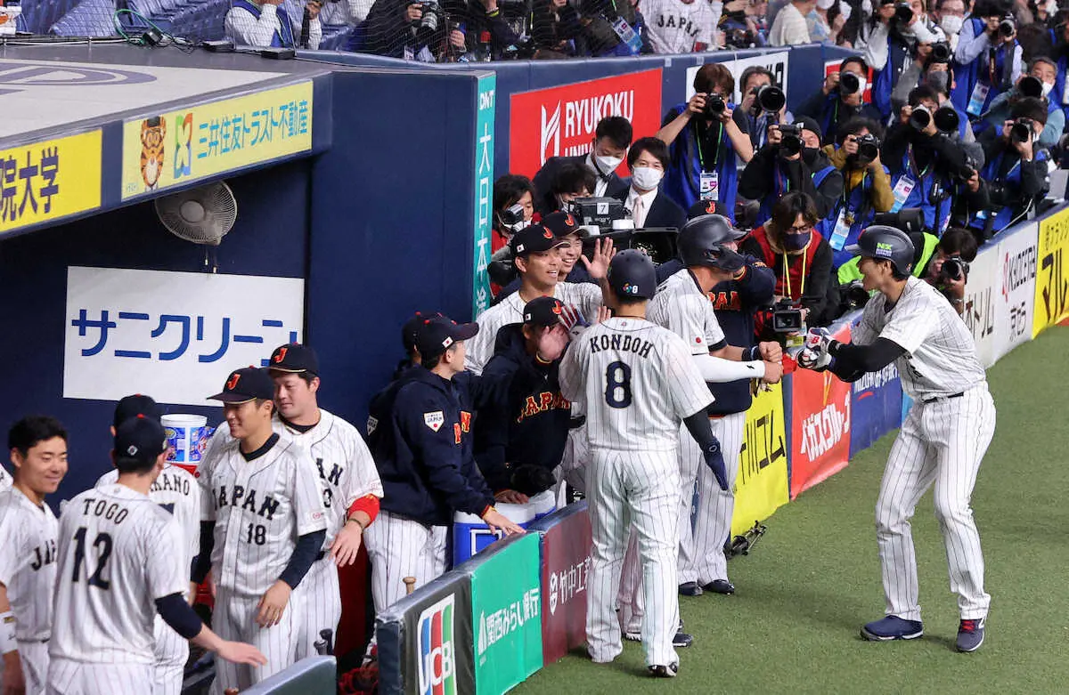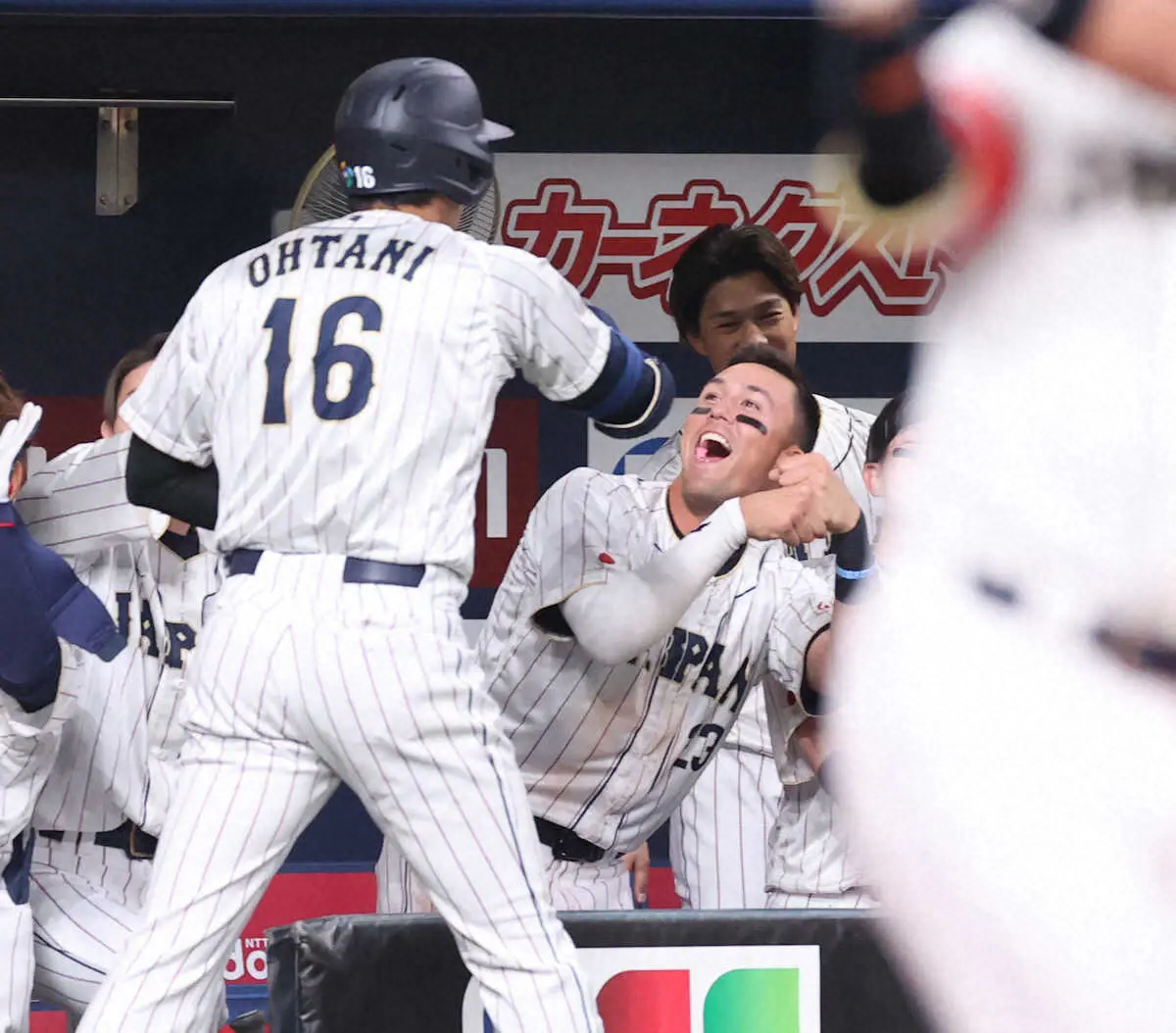 強化試合<神・侍>5回2死一、二塁、大谷の3点本塁打に盛り上がるヌートバー(23番)ら侍ジャパンナイン(撮影・平嶋 理子)