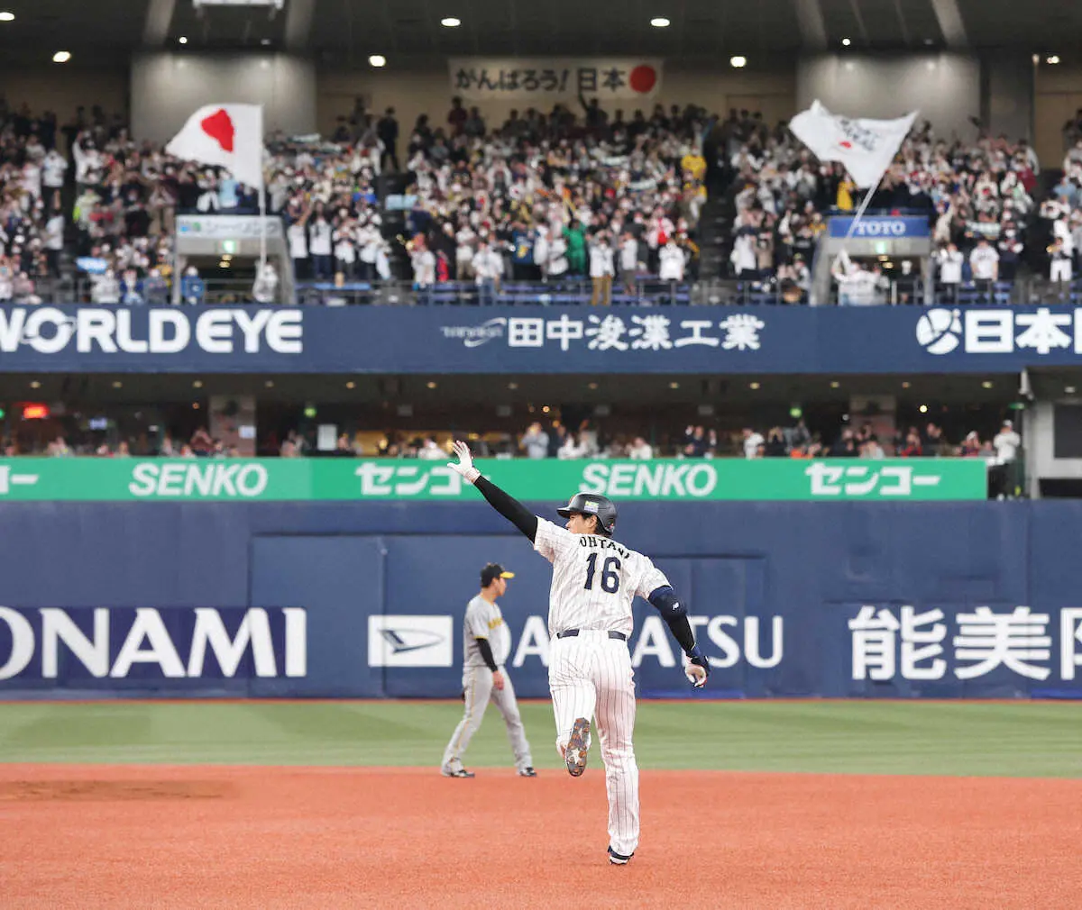 <神・侍>3回2死一、二塁、3点本塁打を放ち、ヌートバーと「ペッパーグラインダー」ポーズを決める大谷(撮影・北條 貴史)