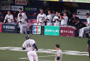 強化試合<神・侍>5回2死一、二塁、大谷の2打席連続の特大弾にヌートバー(中央)らナインも驚がく(撮影・大森 寛明)