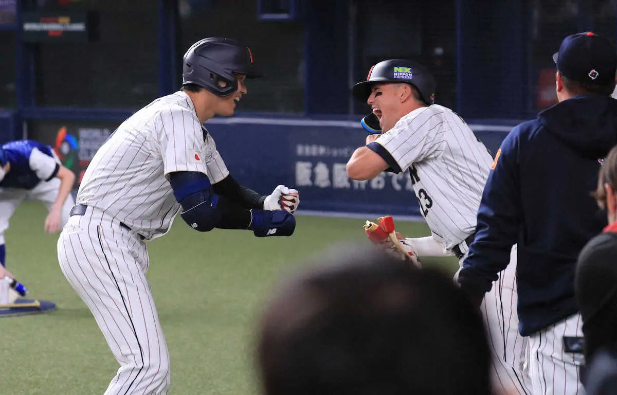 強化試合<神・侍>3回2死一、二塁、中越え3ランを放った大谷(中央)はヌートバー(左)とハイタッチをかわす(撮影・大森 寛明)