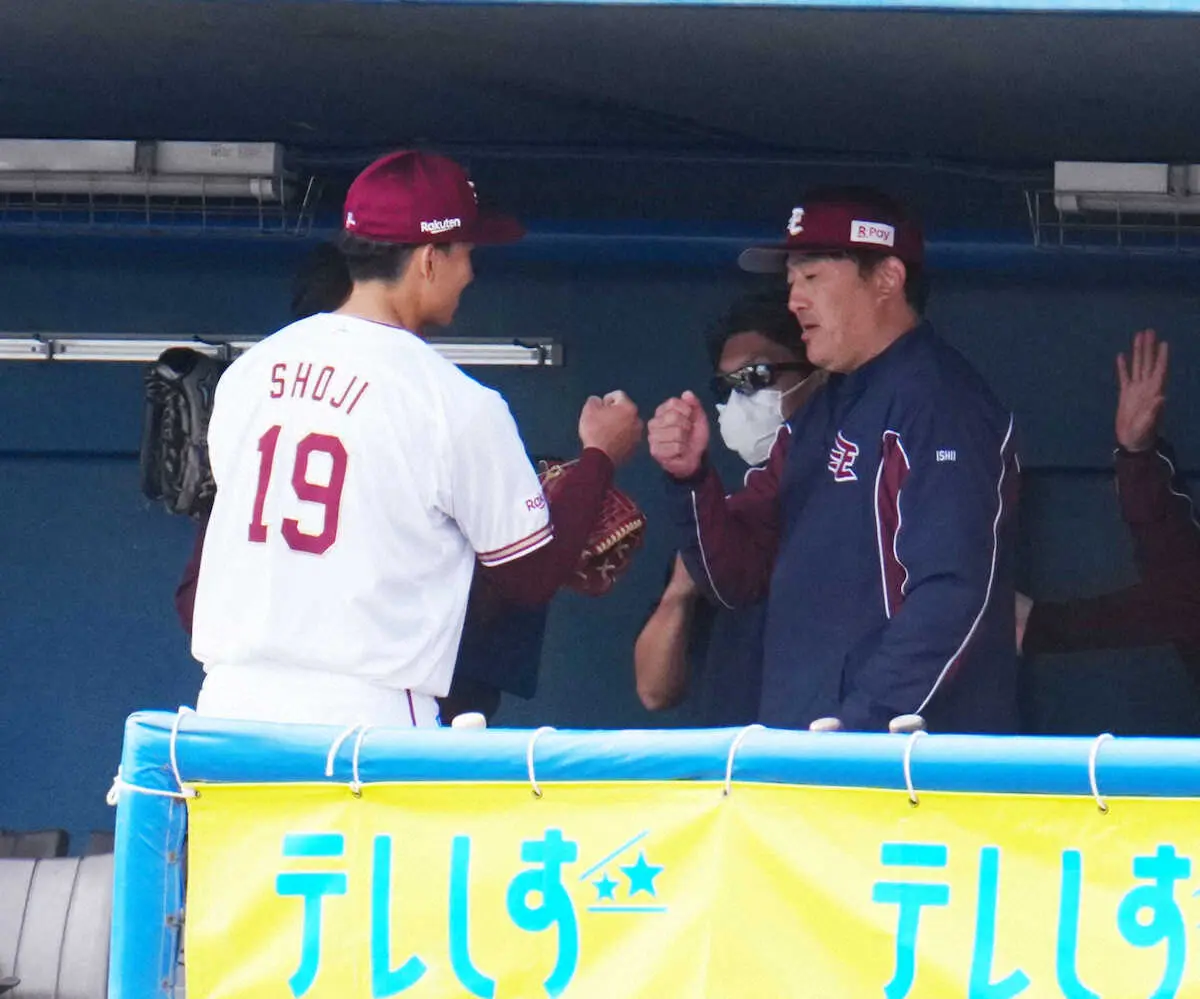 オープン戦<楽・D>5回、降板した荘司(左)を迎える石井監督(撮影・島崎忠彦)