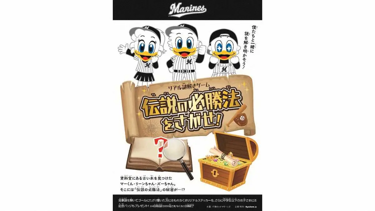 ロッテは10日、4月5、6日の日本ハム戦と8、9日の楽天戦(いずれもZOZOマリンスタジアムで午後2時試合開始)で春休みファミリー向けイベントとしてリアル謎解きゲーム「伝説の必勝法をさがせ!」を開催すると発表した。リアル謎解きゲームの実施は2019年以来4年ぶりの開催となる。