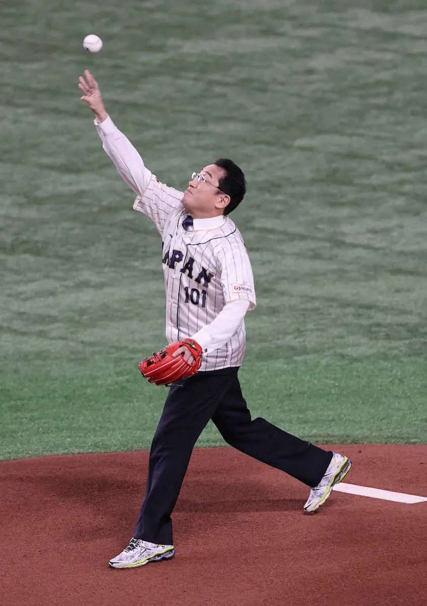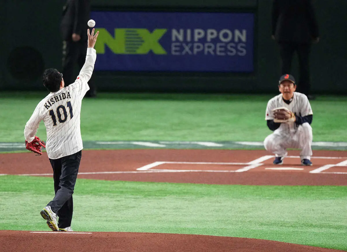 WBC1次R<日本・韓国>始球式を行った岸田首相(右)は栗山監督のサイン入りの始球式使用ボールを掲げる(撮影・篠原岳夫) Photo by スポニチ 岸田文雄首相 WBC韓国戦始球式ワンバン投球で“球場騒然” 栗山監督のサイ… ギャラリーで見る この記事のフォト 2023年03月10日の画像一覧 もっと見る 2023年03月10日の画像をもっと見る