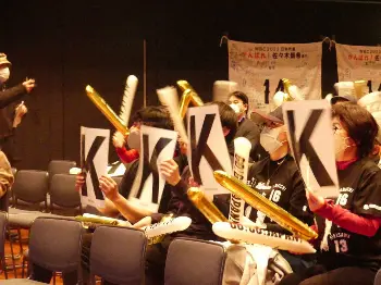 寄せ書きがびっしりと書かれた5枚の応援旗。後援会が事前に同市内のショッピングモールに置き、市民からメッセージを募ったものだ。その応援旗が掲げられたPV会場で、村上さんも固唾(かたず)をのんで投球を見守った。