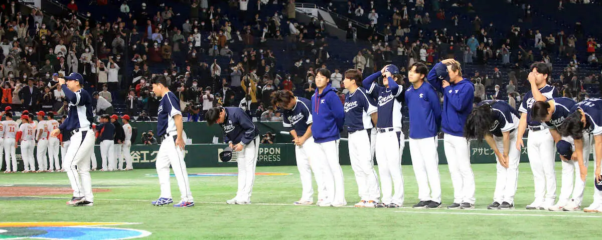 <中・韓>5回、コールド勝ちしたものの1次リーグ敗退にうつむきがちな韓国ナイン (撮影・西川 祐介) Photo by スポニチ 【WBC】韓国 史上最多22得点も笑顔なき終戦…指揮官「国民に心から申し訳… ギャラリーで見る この記事のフォト 2023年03月13日の画像一覧 もっと見る 2023年03月13日の画像をもっと見る
