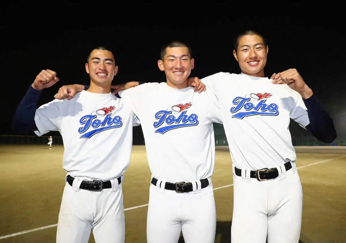 肩を組み笑顔を見せる(左から)東邦の上田、石川、山北 (撮影・後藤 大輝)