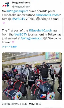 プラハ空港のツイッターが、選手たちが空港で取材を受けている様子を投稿。「WBCに出場したチェコ代表の第1便がプラハ空港に到着しました。おかえりなさい!」とつづったもので、同国の大使館も「チェコ代表チーム、無事にプラハに到着したようです」と報告したもの。