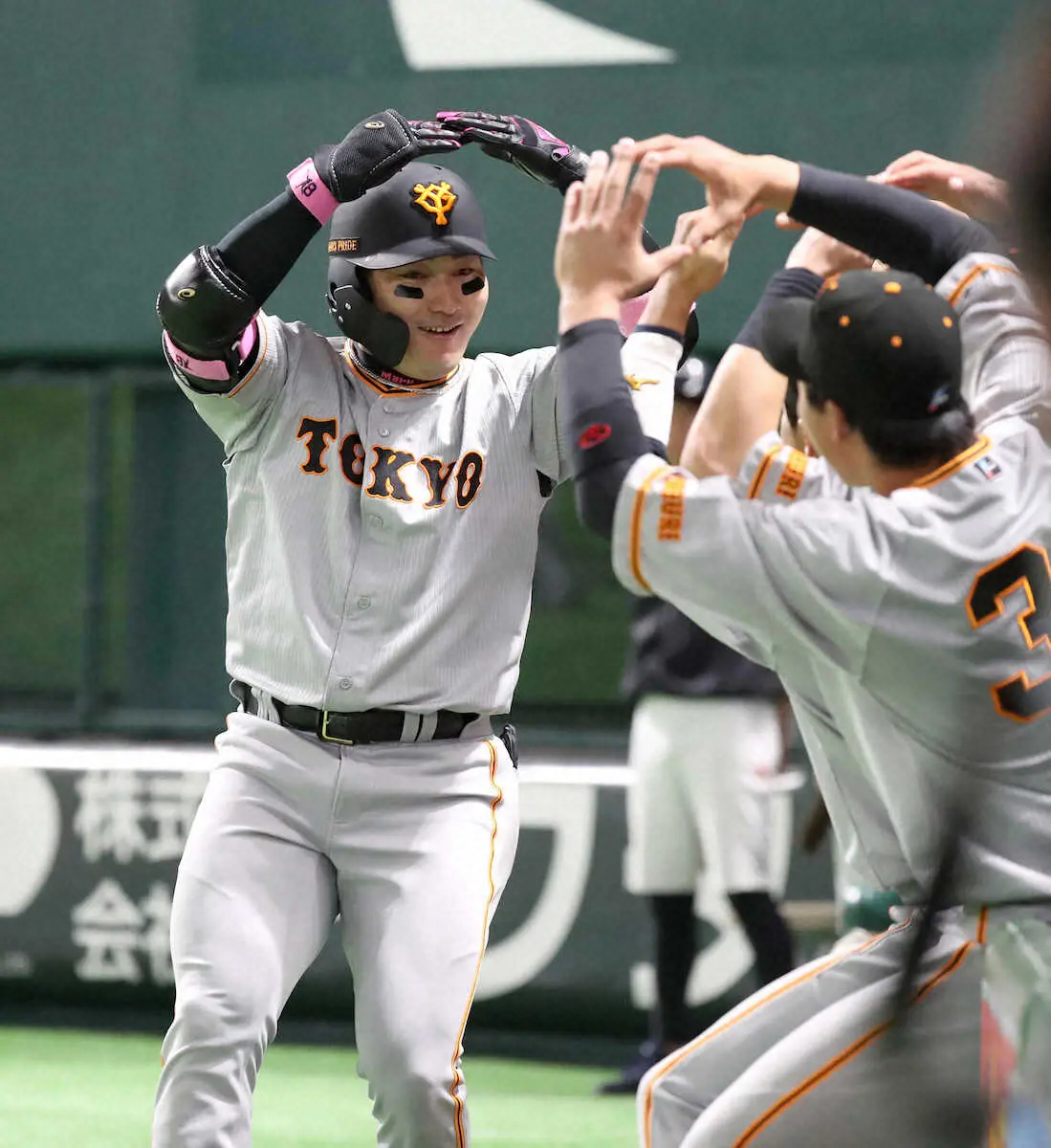 <ソ・巨>4回無死、左越え本塁打を放った丸はナインとポーズを取る(撮影・中村 達也)