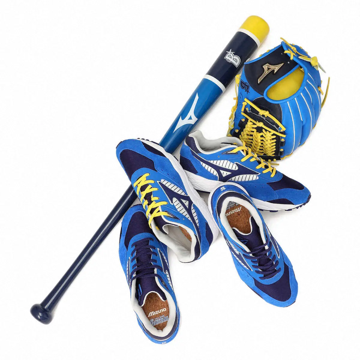 同製品はDeNAの象徴的なブルーを基調に、白地に青のピンストライプを組み合わせることで伝統と歴史ある球団の力強さを表現。また硬式球の芯材として使用されるコルク材からインスピレーションを受けた中敷きも特徴の1つで、港町・横浜の街に映えるエッセンスを加えたデザインに仕上げている。今回はスニーカーのカラーリングに合わせたマスコットバットとグローブも併せて発売する。