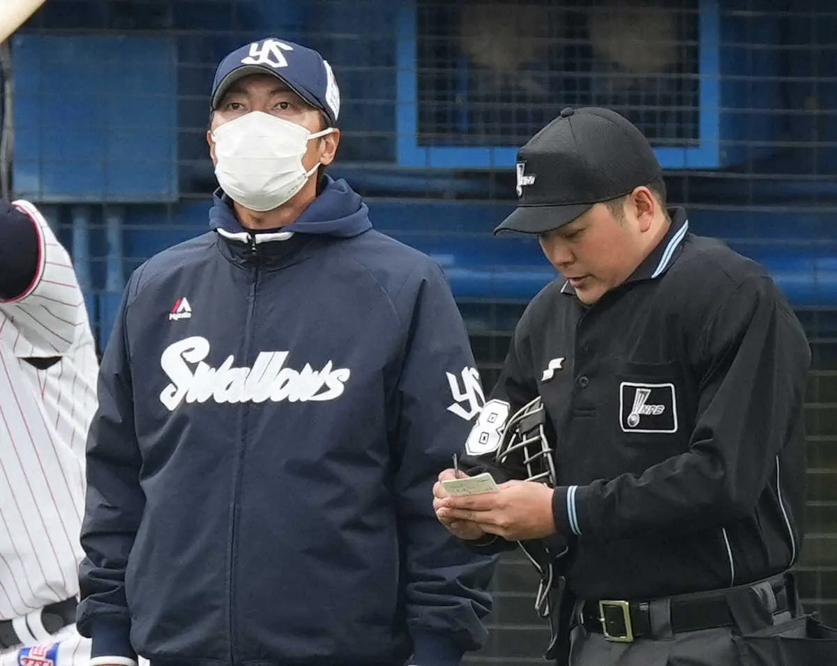 オープン戦<ヤ・神>9回、選手交代を告げる高津監督(左)(撮影・木村 揚輔)