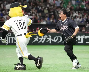 ソフトB セレモニアルピッチにカンニング竹山が登板 球団マスコットのハリー・ホークに投げられてキレる