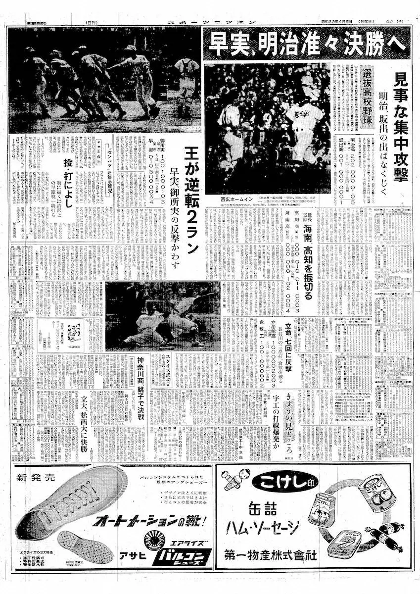 早実・王の逆転2ランを報じる1958年4月6日付スポニチ紙面