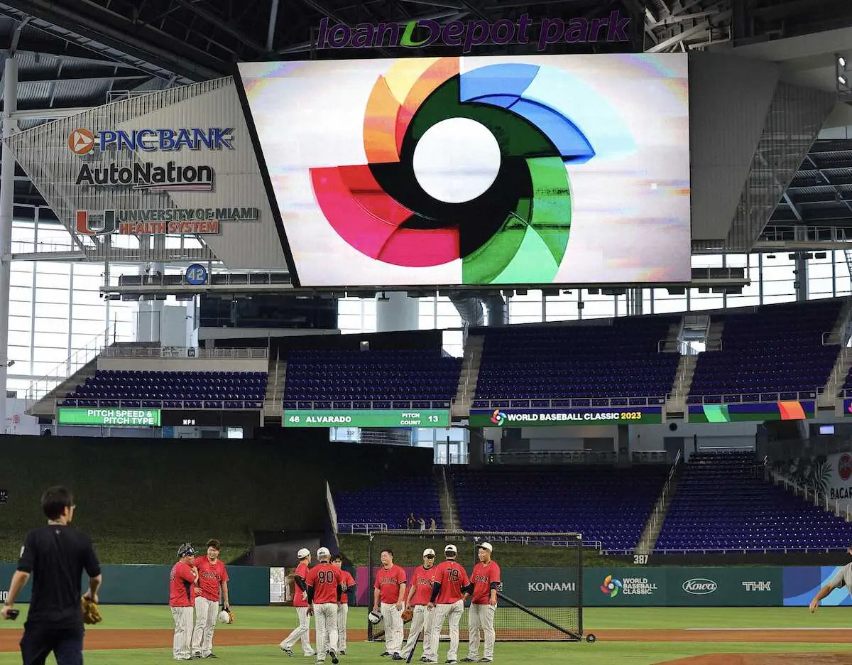 第5回ワールド・ベースボール・クラシック(WBC)に出場中の侍ジャパンは19日(日本時間同日深夜)、20日(同21日午前8時試合開始)に行われる準決勝・メキシコ戦に向け、試合会場となるマーリンズの本拠地「ローンデポ・パーク」で最終調整をスタート。練習中も洋楽で爆音が流れる中、内外野のシートノックが行われた。