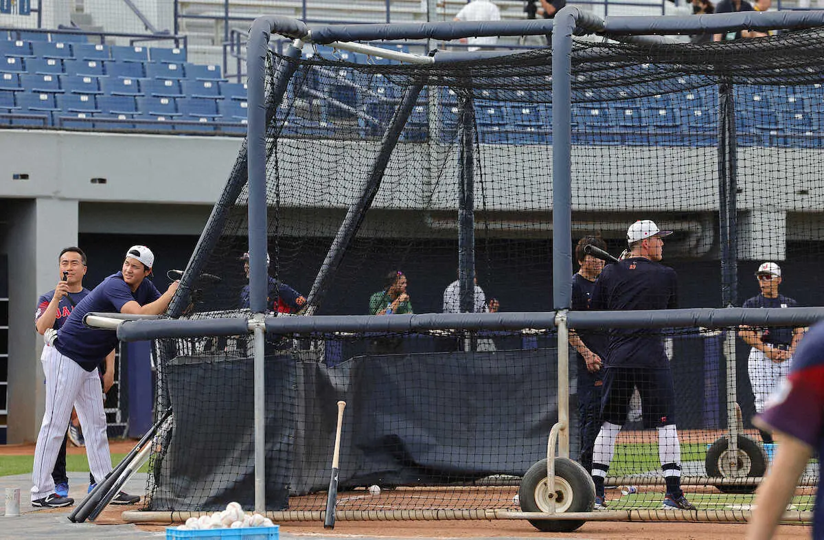 打撃練習をするヌートバー(右)を撮影する大谷(撮影・光山 貴大)