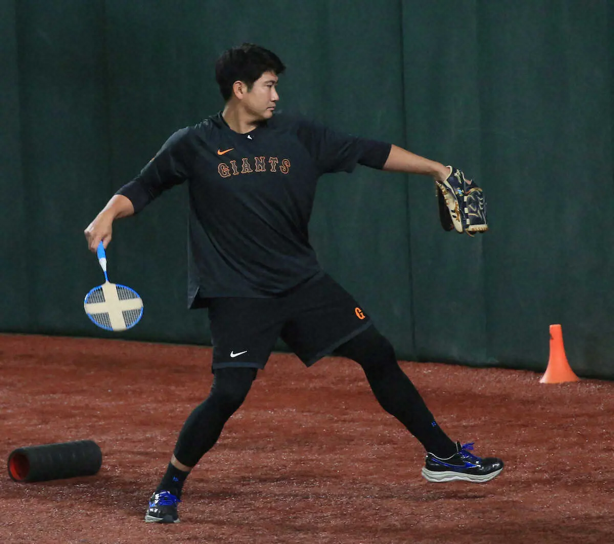 <巨・D>試合前にバドミントンラケットを手にアップを行う菅野(撮影・西川 祐介)