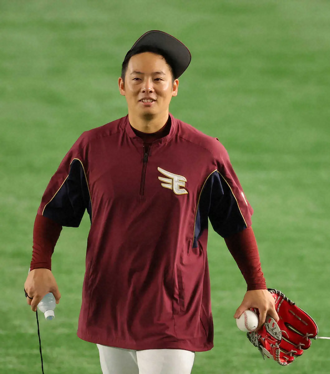 前日に米マイアミから帰国。巨人とのオープン戦を前にユニホームを着て笑顔でグラウンドへ。則本らと言葉を交わした。