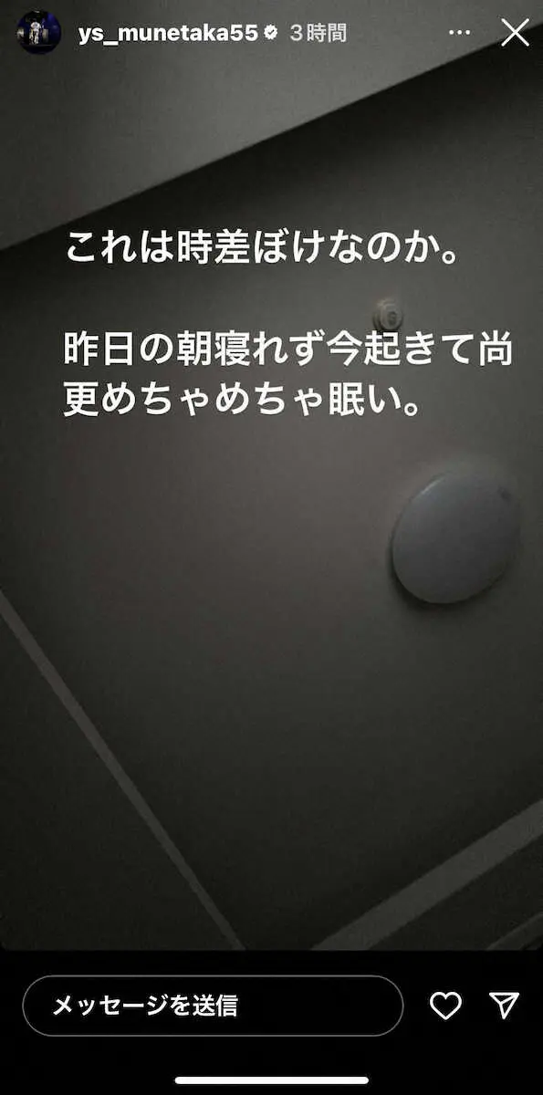また、村上は午後4時ごろに自身のインスタグラムを更新。「これは時差ぼけなのか。昨日の朝寝れず今起きて尚更めちゃめちゃ眠い。」と、ゆっくりと寝て過ごしたことを報告した。
