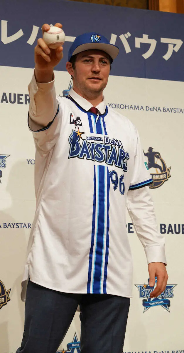 スプリットチェンジで村上斬りだ!DeNAに新加入した前ドジャースでサイ・ヤング賞右腕のトレバー・バウアー投手(32)が24日、横浜市内で入団記者会見。メジャー通算83勝の超大物は、新球種「スプリットチェンジ」でのヤクルト・村上宗隆内野手(23)攻略へ意欲を見せた。また、VIP会員の入会料220万円という、球団初の選手個人ファンクラブも設立。超VIP右腕の日本デビューに注目が集まる。