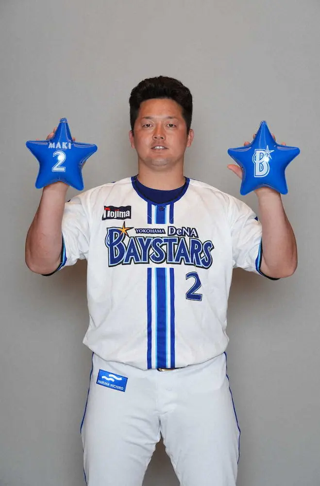ベイスターズの新グッズをアピールする牧(球団提供)