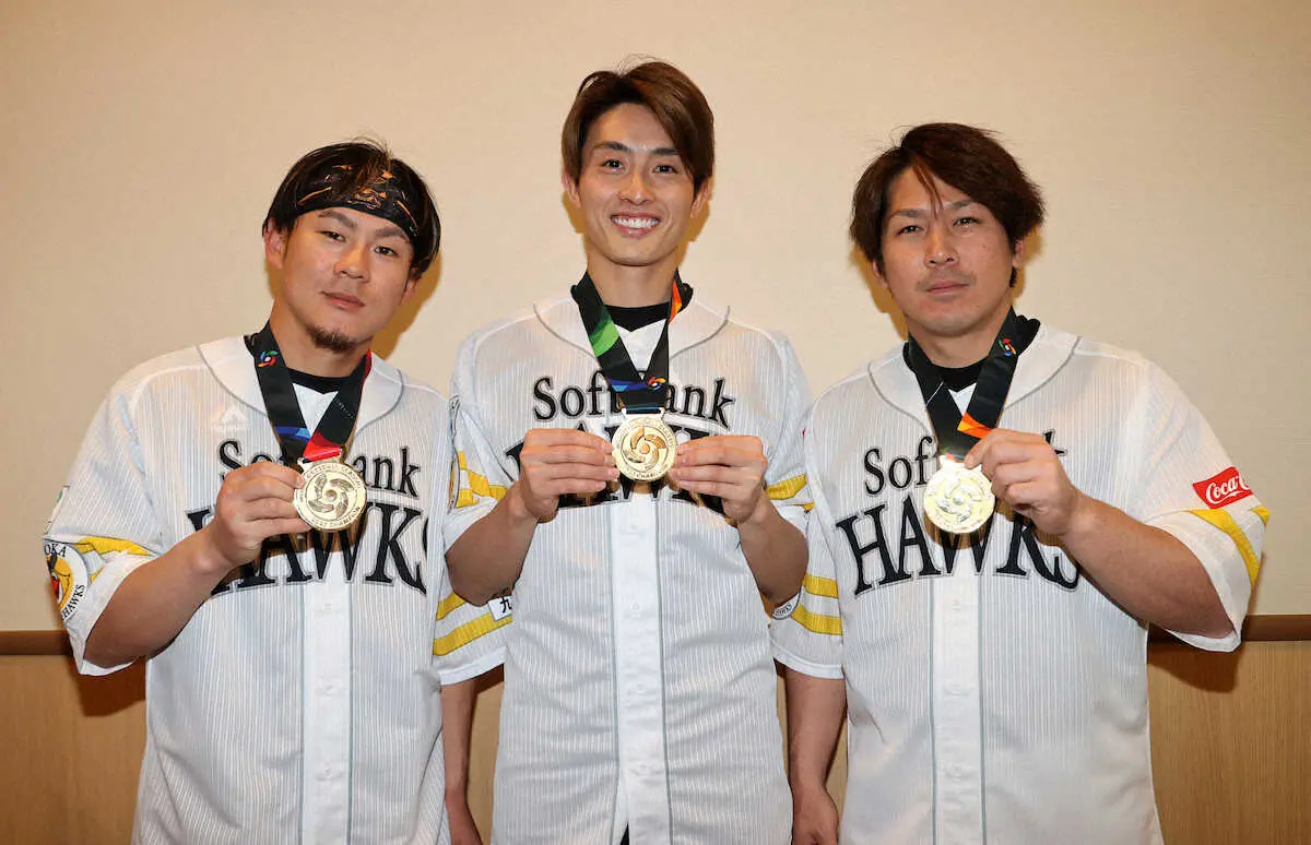 WBC(ワールド・ベースボール・クラシック)日本代表として、世界一に貢献したソフトバンク甲斐拓也捕手(30)、牧原大成(30)、周東佑京の両内野手(27)が25日の広島戦前にペイペイドームを訪れ、対応した。