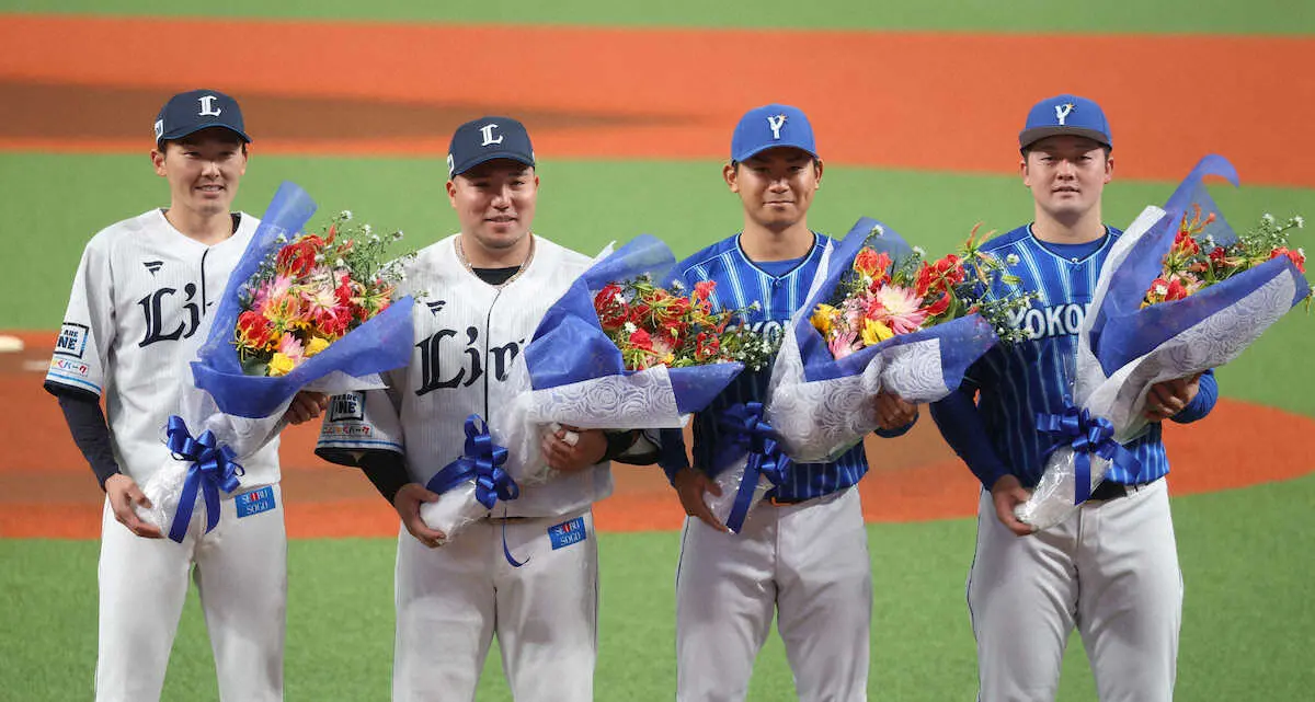 西武―DeNA戦の試合前、WBCで世界一に輝いた西武の山川、源田、DeNAの今永、牧が優勝記念セレモニーに登場し、松井、三浦両監督から花束を受け取った。