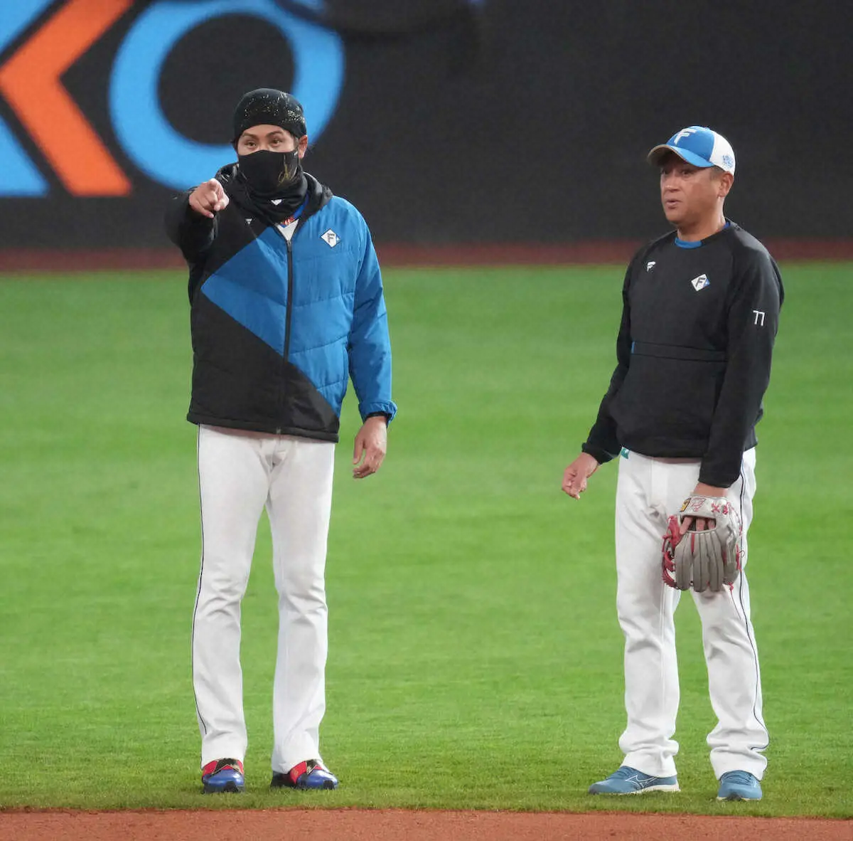 林ヘッドコーチ(右)とグランドをチェックする新庄監督(撮影・高橋 茂夫)
