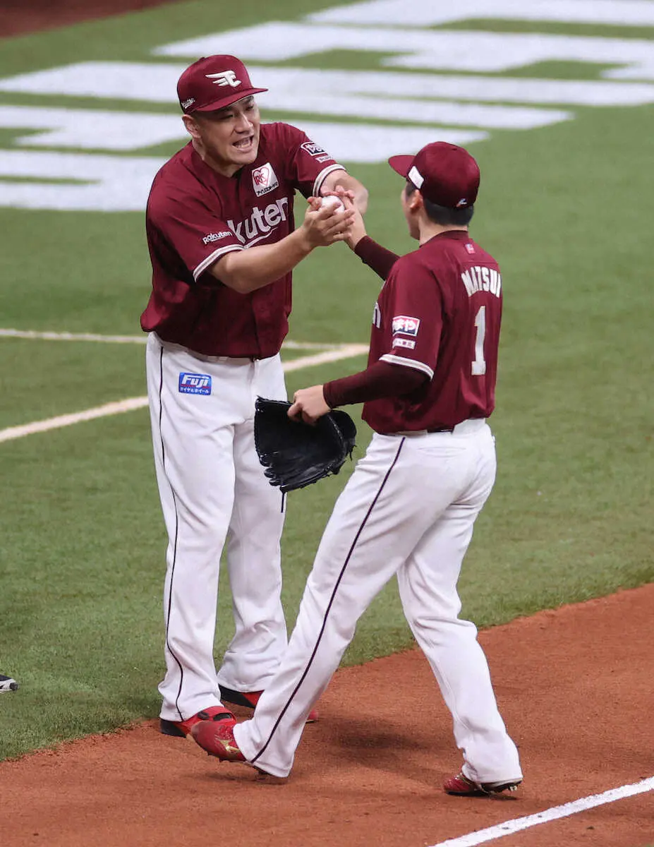 <日・楽>松井裕からウイニングボールを受け取る田中将(左)(撮影・篠原岳夫)