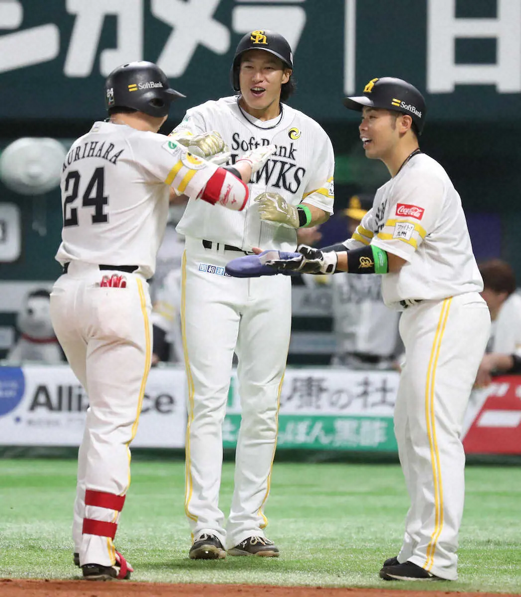 <ソ・ロ1>6回無死一、二塁、右中間越え本塁打を放った栗原(左)を出迎える柳田(中)と近藤(撮影・中村 達也)