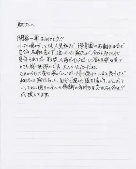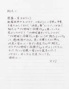 文面には愛情がにじむ。依頼したのは3月上旬。ゆりさんは「手紙ですか~。お恥ずかしいですが…」と苦笑いを浮かべながらも約3週間をかけて書いてくれた。幼少期から「自分が好きなことをとことんやればいい」が教育方針。善文さんが根っからの野球好きとあって物ごころつく前から野球に没頭し、ゆりさんも脇目も振らずに信じた道を突き進む性格を誰よりも理解し、黙って背中を押した。