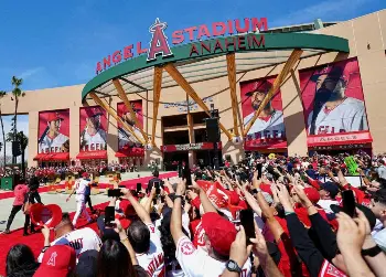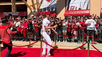 <エンゼルス・ブルージェイズ>試合前、レッドカーペットに登場した大谷(撮影・柳原 直之)