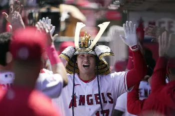 3-5の5回、レンヒーフォのソロで1点差に迫ると、無死一、二塁から継投したばかりのシンバーの直球を左中間席に運ぶ3号3ランで試合をひっくり返した。3ボール1ストライクからの一発に「良いカウントで打てた。ここ数日、ボールがよく見えている」と納得の表情。ダイヤモンドを一周してベンチに戻ると、2試合続けて“兜”をかぶり、“トラウト将軍”になりきった。