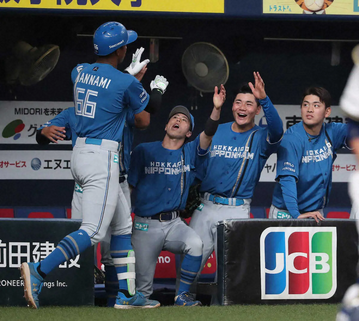 <オ・日>3回、ソロを放ち生還する万波(左)を迎える(右から)野村、清宮ら(撮影・後藤 正志)