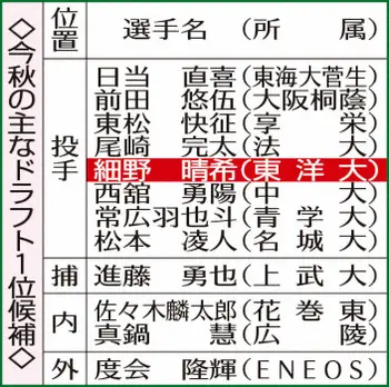 ◇細野 晴希(ほその・はるき)2002年(平14)2月26日生まれ、東京都八王子市出身の21歳。加住小2で野球を始め、東海大菅生中では軟式野球部に所属。東亜学園(東京)では1年夏からベンチ入りも甲子園出場はなし。東洋大では1年秋にリーグ戦デビュー。50メートル走6秒7、遠投125メートル。1メートル80、87キロ。左投げ左打ち。