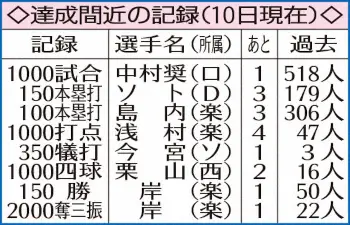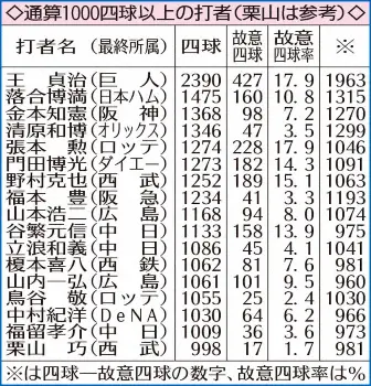 達成までは時間がかかったが、敬遠による“もらった”四球が極めて少ない、特徴的な大台到達になりそう。栗山の通算998四球のうち、故意四球はわずか1・7%の17個しかなく、ほとんどの四球が自慢の選球眼で選び取ったものだ。過去の1000四球達成者と比較すると、鳥谷敬(ロ)の2・4%(1055四球のうち故意四球25)を下回り最も低い割合。四球から故意四球を除いた「自力四球」は981となり、この数字では王貞治(巨=1963)を筆頭に歴代12位タイの多さになっている。巧みな打撃と選球眼でまだまだ奮闘する大ベテランの記録に注目だ。(記録課・志賀 喜幸)