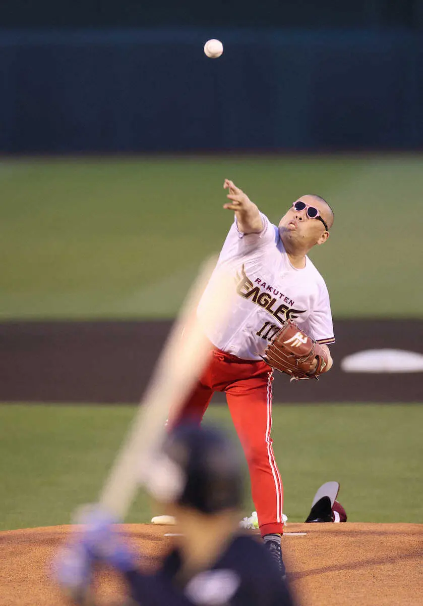 <楽・オ>始球式の野生爆弾くっきー、最後は暴投気味のボールに(撮影・篠原岳夫)