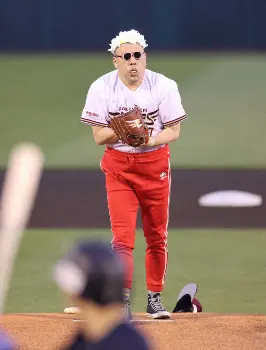サングラスをかけ、背番号「117」のユニホームに真っ赤なジャージーをハイウエストではく個性的な出で立ちでグラウンドに登場した。大きく振りかぶった際にキャップが外れて白髪姿なると、スタンドからは笑いがおきた。再び振りかぶると、今度は白髪のカツラがとれてスキンヘッドになり、そのまま投じた球は打者の背中側に外れる大暴投。最後はキャップとかつらを拾い上げて、マウンドを後にした。