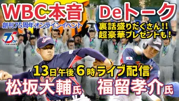 2024年2月1日に創刊75年を迎えるスポーツニッポン新聞社の「創刊75周年オンラインイベント第2回」が13日、東京本社で行われ、スポニチ本紙野球評論家の松坂大輔氏(42)と、日米通算2450安打で昨季限りで現役を引退した福留孝介氏(45)が出演。06年の第1回、09年の第2回の優勝メンバーである両氏が現場取材で見た裏話や次回大会に向けての課題、展望などを語り合った。