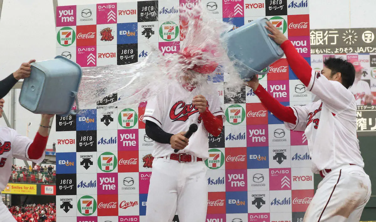 【画像・写真】広島・秋山 3874日ぶりサヨナラ弾で大逆転勝ち!お立ち台で恒例シャワー「34歳を締めくくった」