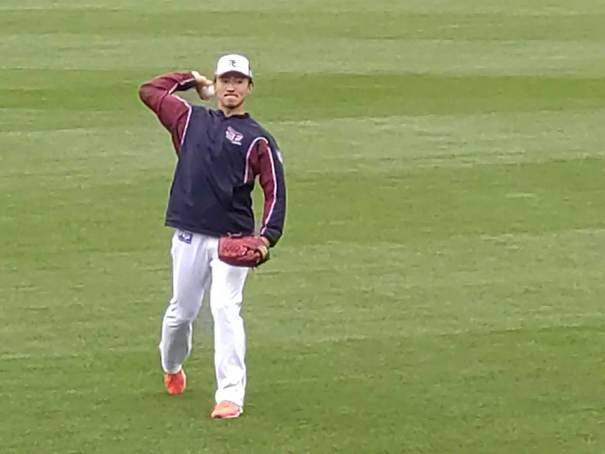 22日のデビュー登板へ楽天モバイルパークでキャッチボールする楽天・荘司
