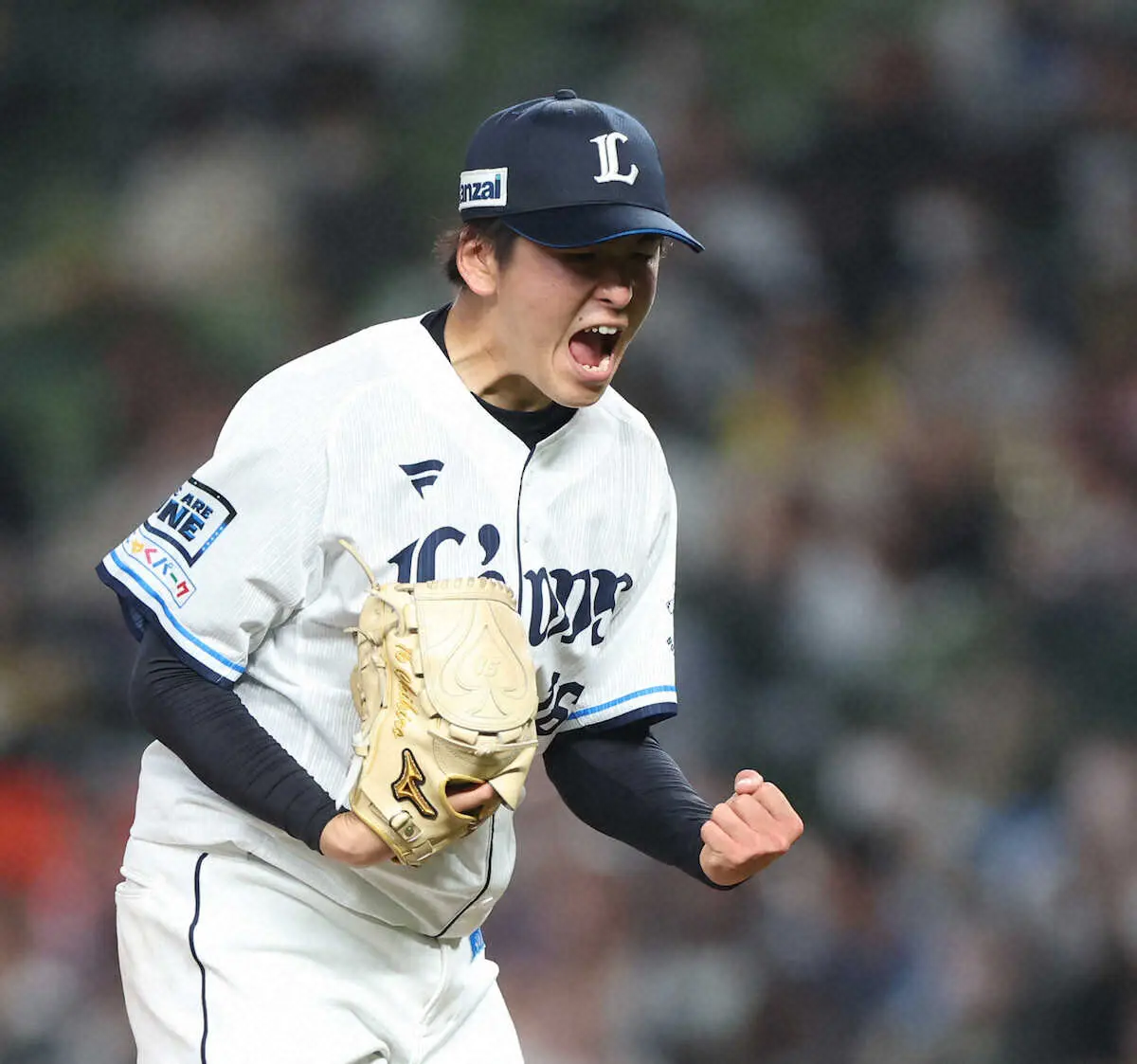 <西・ソ>6回、増田を打ち取りガッツポーズする隅田(撮影・白鳥 佳樹)