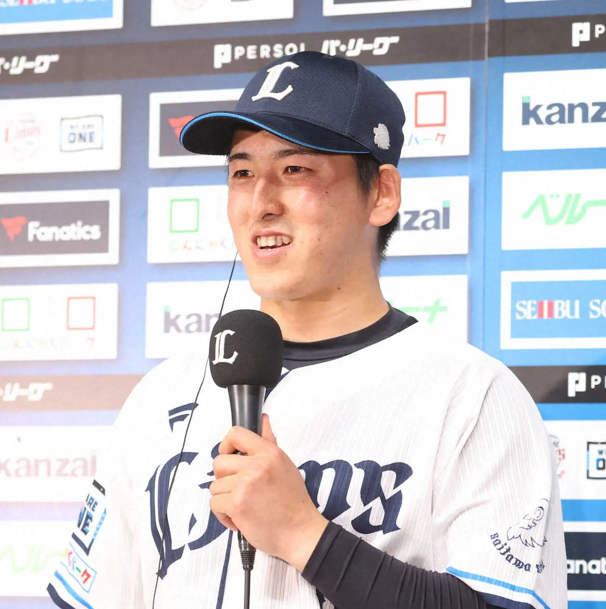 <西・ソ>目を潤ませながら――。389日ぶりとなるプロ2勝目を挙げ、ヒーローインタビュー中に汗を拭う隅田(撮影・白鳥 佳樹)