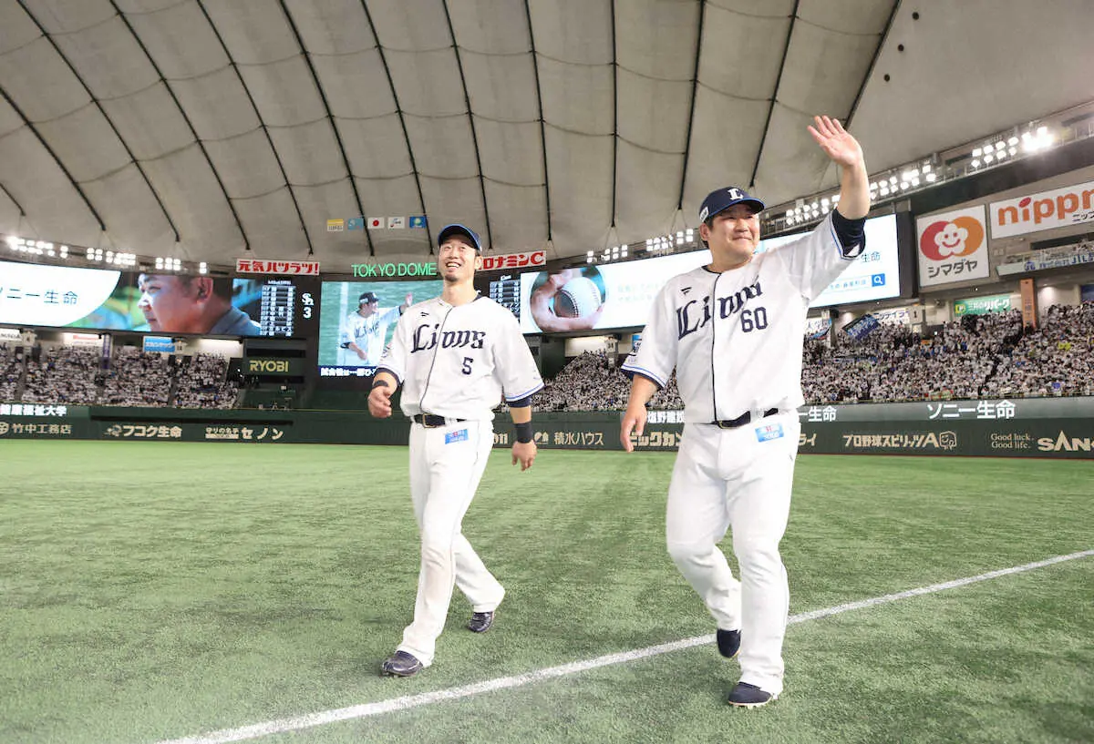 球団5年ぶり2度目の東京ドームの主催試合は4万1568人が来場。殊勲の一発でチームを今季初の3連勝に導いた。お立ち台で今季目標を問われ「こんな大勢の前で発表するんですか?」とかわし「明日、ベルーナドームで(観客が)少ないと寂しいので来られる方はお願いします」と締めた。東京ドームで新旧の「西武の顔」が輝いた一日だった。(神田 佑)