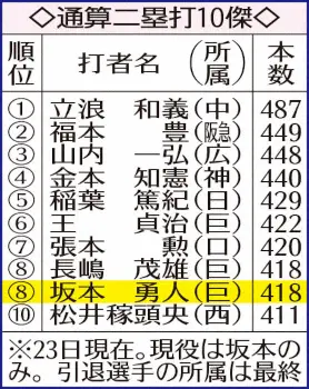 通算二塁打10傑 Photo by スポニチ 巨人・坂本 ミスターに並んだ歴代8位の418二塁打 今季2度目のマルチ安打も ギャラリーで見る この記事のフォト 2023年04月24日の画像一覧 もっと見る 2023年04月24日の画像をもっと見る