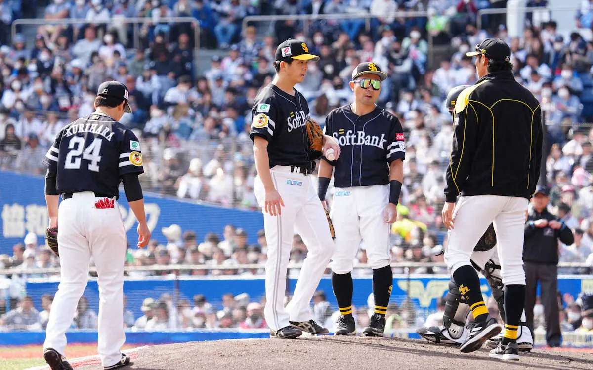 3回、制球が定まらないソフトバンク・大関にナインが集まる(撮影・長久保 豊)