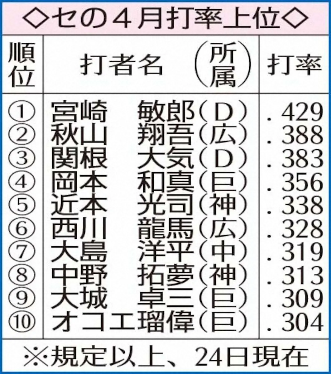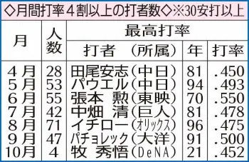 月間打率4割以上の打者数 Photo by スポニチ DeNA・宮崎&広島・秋山 4月の月間打率4割超なるか? ギャラリーで見る この記事のフォト 2023年04月25日の画像一覧 もっと見る 2023年04月25日の画像をもっと見る