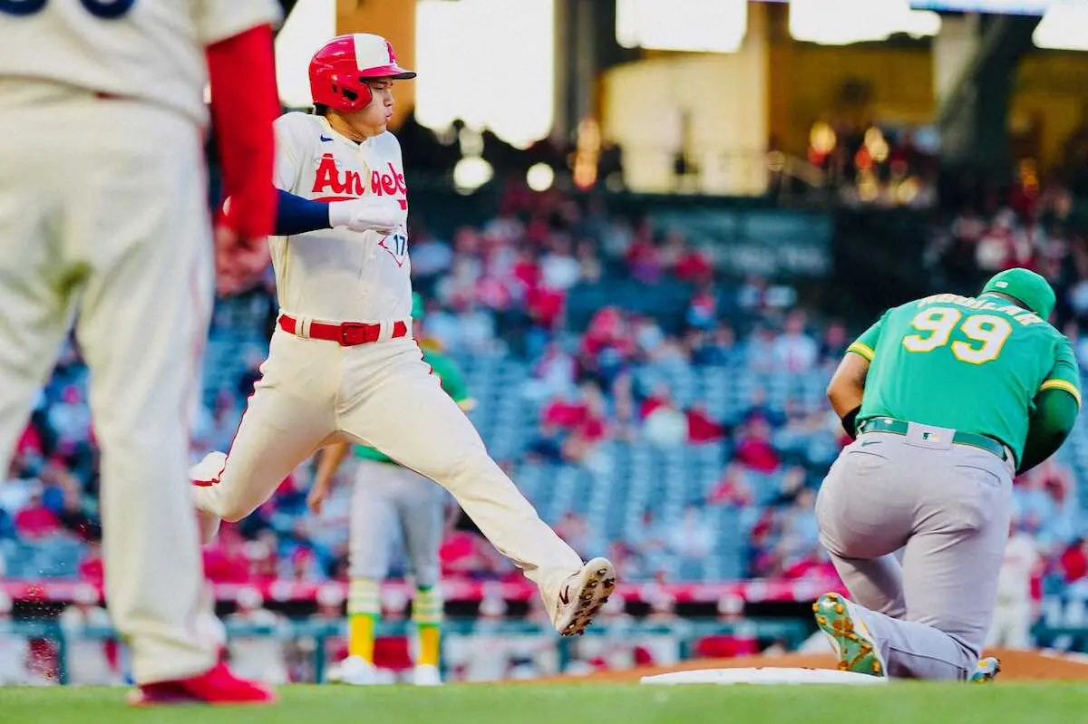 <エンゼルス・アスレチックス>2回1死満塁、大谷の一ゴロの間に追加点を奪うエンゼルス(撮影・会津 智海)