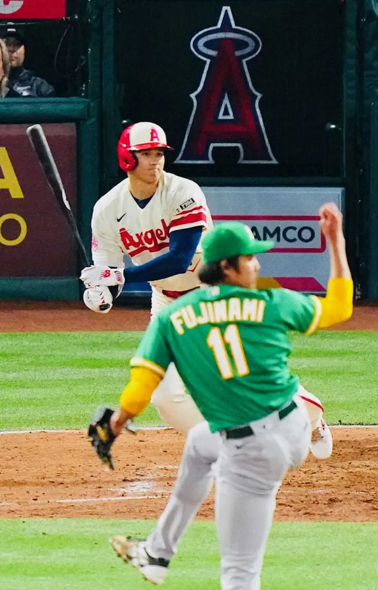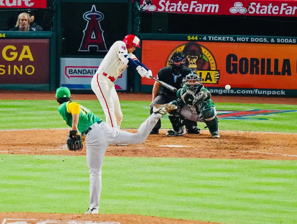 <エンゼルス・アスレチックス>6回、藤浪から左前打を放つ大谷(撮影・会津 智海)