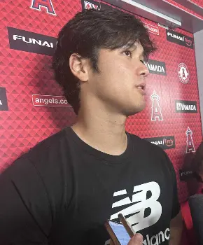 試合後の囲み取材に応じる大谷(撮影・柳原 直之)