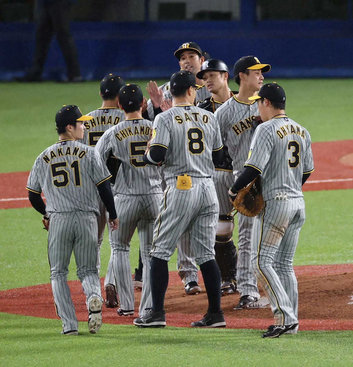 先発の村上が8回無失点の好投で、規定投球回にも到達し、防御率「0・00」でリーグトップに。開幕から25回連続無失点となった。打線も佐藤輝の今季初となる1試合2本塁打や、村上と同じ淡路島出身の近本の適時打など効果的に得点を積み重ねて援護。圧勝と言える内容だった。