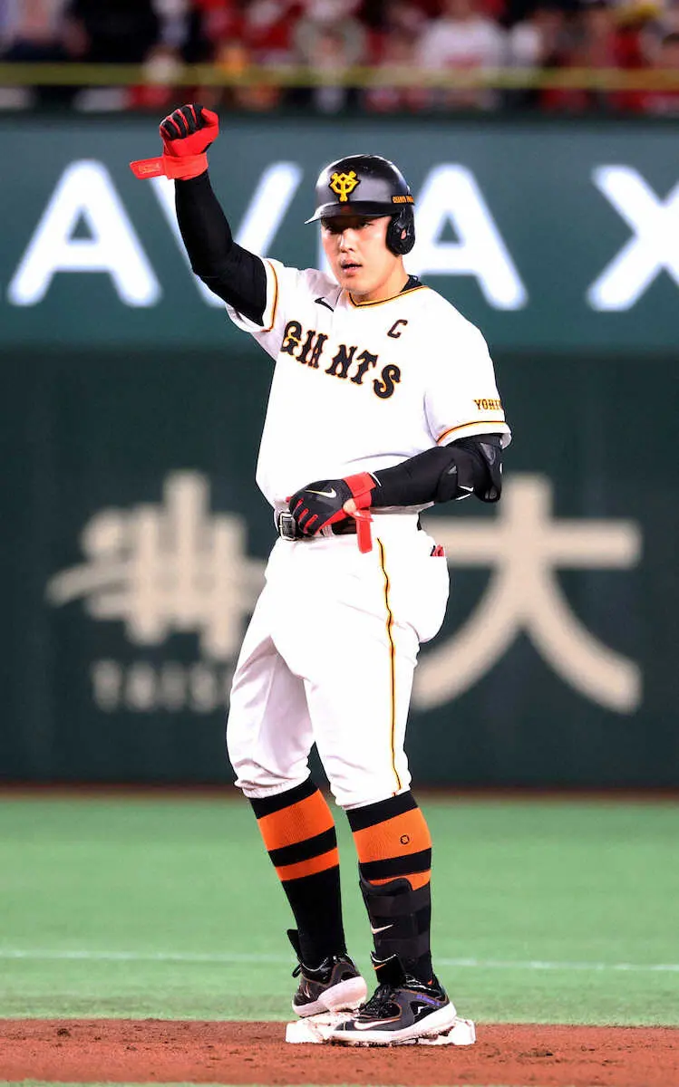 <巨・広>初回、先制の適時二塁打を放つ岡本和(撮影・西川 祐介)